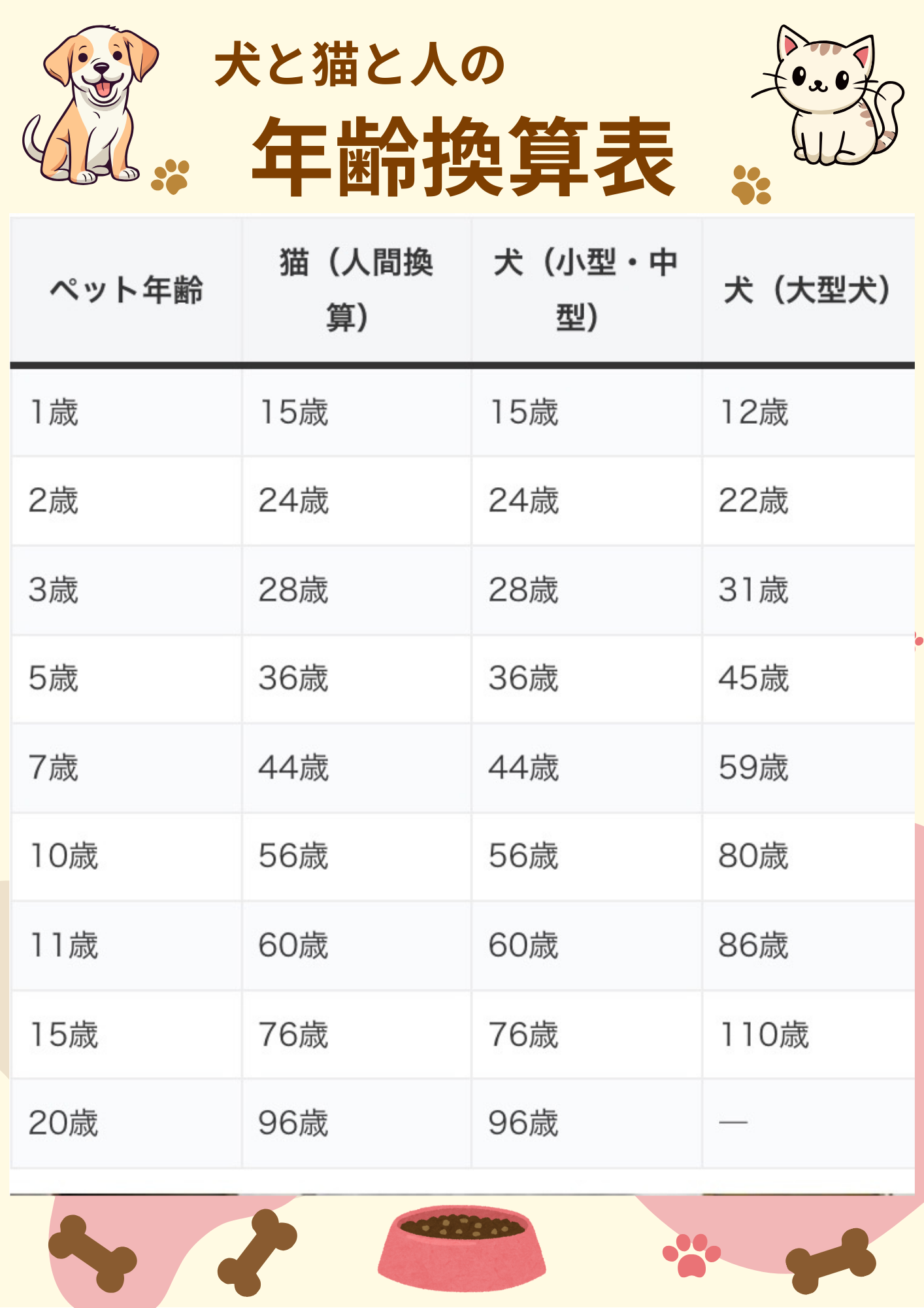 突然ですが、犬や猫と暮らしていると、「うちの子って人間の年齢で言うと何歳くらいなんだろう?🤔」と考えたことはありませんか?