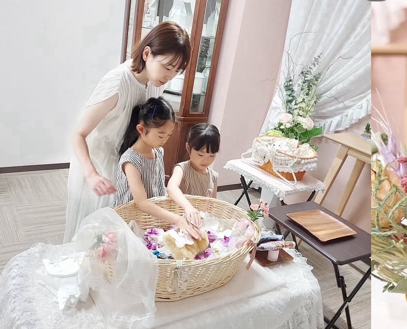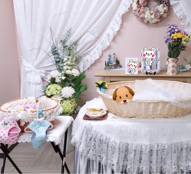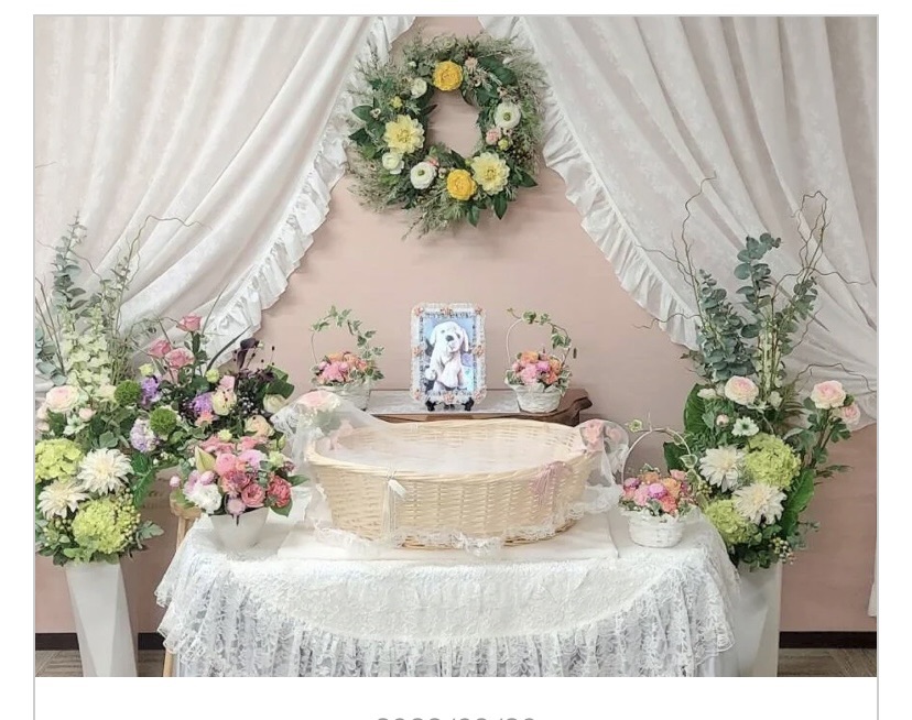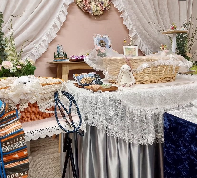 ペットちゃんを籠の中に入れて頂き、持ち込んで頂いたお花やフード、好きだったおやつやおもちゃ、ブランケット等を祭壇に飾って頂きます。💐🦴🧸